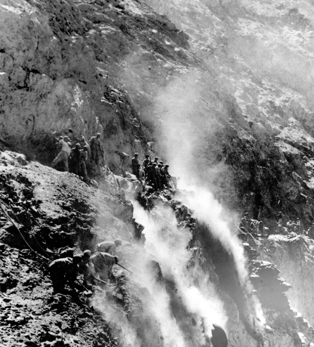 筑路戰士在懸崖絕壁上修建川藏公路。(資料圖片)