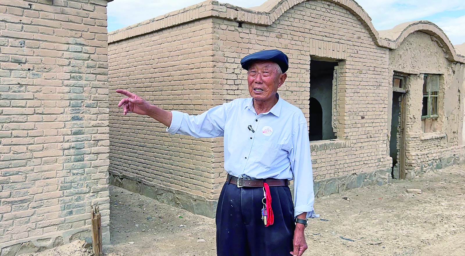 景生芳在窯洞磚房前向記者講述過去的故事。才貢加 攝