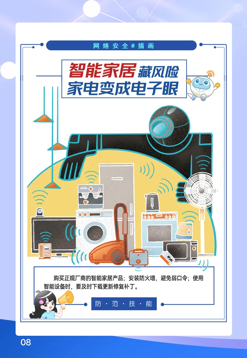 公共WiFi能不能隨便蹭?在社交軟件發圖要注意什么?智能家居也會變成電子眼?……這些網絡安全知識你都知道嗎?相關插畫作品接下來將在全區各新時代文明實踐分中心展示哦!