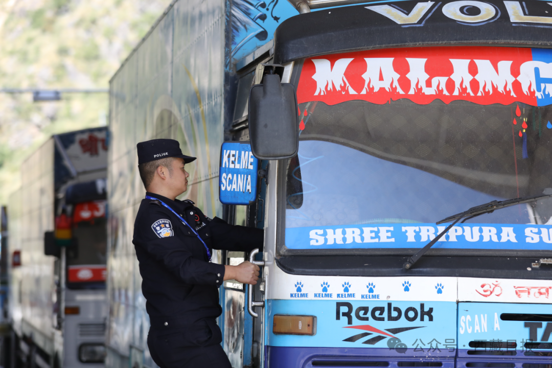 圖為吉隆出入境邊防檢查站民警正在檢查出境尼泊爾貨車。記者 旦增蘭澤 通訊員 肖富貴 攝