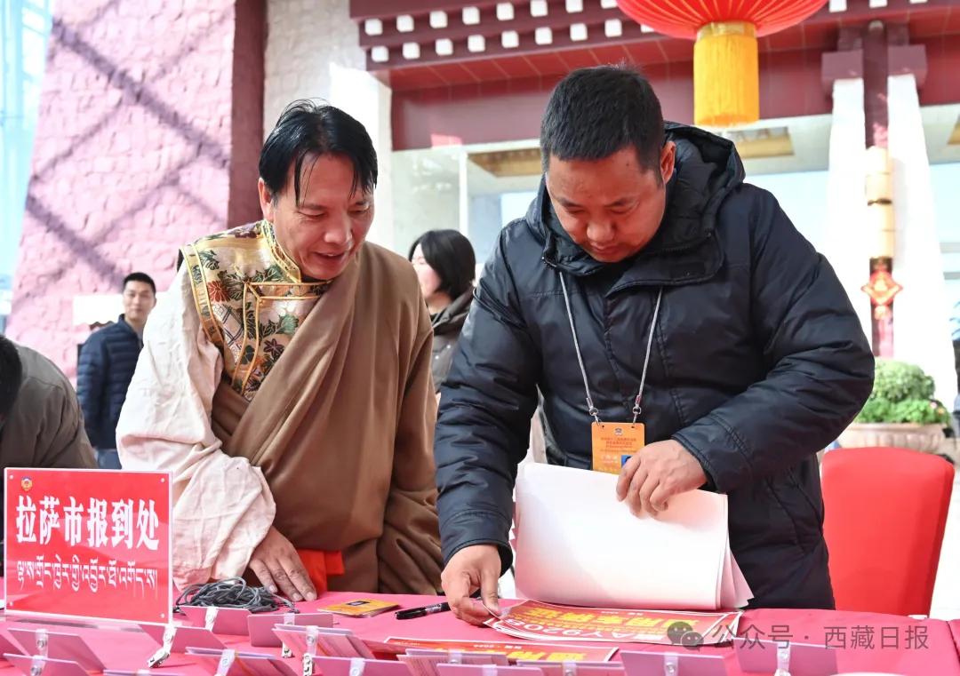 圖為參加自治區十二屆人大四次會議的代表在駐地領取證件和會議材料。記者 歐珠次仁 平措諾吉 攝