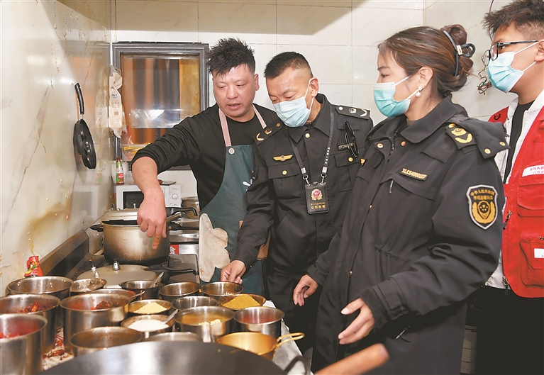 圖為拉薩市城關區(qū)市場監(jiān)督管理局金珠西路市場監(jiān)督所執(zhí)法人員對飯店后廚環(huán)境衛(wèi)生進行檢查。記者 索朗旺久 攝