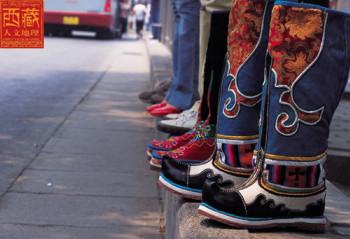 赤列塔青說,在不熟悉的人看來,藏族男女鞋,外觀雖然很像舞臺上古裝戲里穿的靴子,用牛皮做底,底高二寸,腰高至小腿之上,鞋面用紅綠相間的毛呢裝飾,鞋腰也有線條、花紋,鞋幫用各色絲線或各色皮革、氆氌、金絲緞制成。但是西藏高原地域遼闊,每個地區都有屬于自己的鞋子,農民和牧人的鞋子更是大相徑庭,人們能從一個人所穿的鞋子判斷出一個人的職業和社會階層。