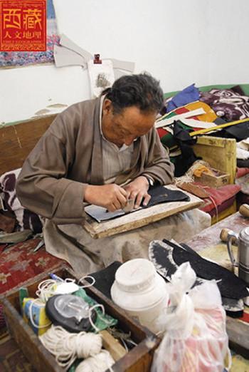 坐在工作臺上的赤列塔青,身材高大,穿一身合體的淺色藏裝,前擺上沾著幾星鼻煙,長期用針的手指有些變形。翻開他的履歷發現,赤列塔青可以說是拉薩少有的制靴世家,他的父親邊巴頓珠在舊社會是個給人支差的貧苦鞋匠,靠給有錢人修鞋、做鞋為生。今年68歲的赤列塔青性格沉穩、做事穩健,他12歲當學徒工,做鞋做了56年,如果再加上父輩的修鞋歷史,時間更長。在今天的拉薩有這樣經歷的人算是屈指可數了。赤列塔青從小就在父親和師傅身邊打下手,逐漸掌握這個足以養家糊口的一技之長,終于成長為一個勤奮而多才的手工藝人,開始了穩坐一隅的匠人生涯。
