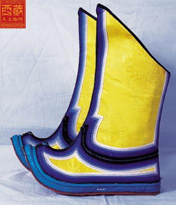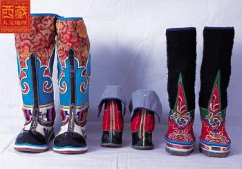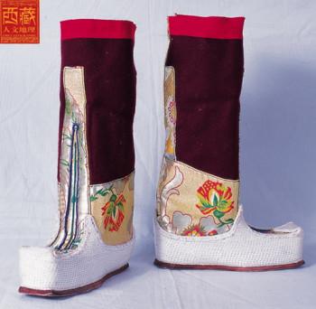 西藏高原地域遼闊,每個地區都有屬于自己的鞋子。藏族男女鞋,外觀雖然很像舞臺上古裝戲里穿的靴子,但用牛皮做底,底高二寸,腰高至小腿之上,鞋面用紅綠相間的毛呢裝飾,鞋腰也有線條、花紋,鞋幫用各色絲線或各色皮革、氆氌、金絲緞制成。人們能從一個人所穿的鞋子判斷出一個人的職業和社會階層。