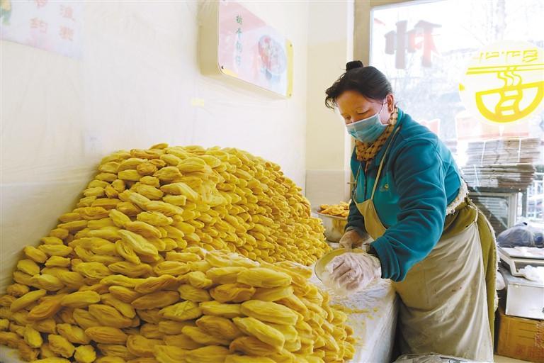 隨著藏歷新年日益臨近,酥油花、“卡賽”等各類年貨在市場上頗為搶手,年貨市場開始進入銷售旺季。 圖為拉薩市節日市場上的商戶正在店鋪內將制作好的“卡賽”排放整齊。 記者 唐斌 次旺 攝