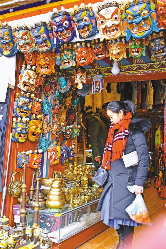 圖為八廓東街上門口掛滿各種藏式面具的店鋪。