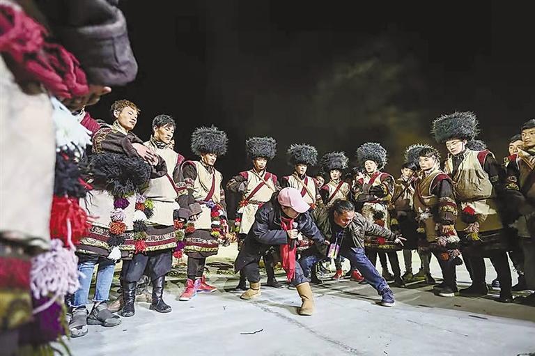 燈光放亮,音樂響起,史詩劇隨著夜色拉開了帷幕,雨中的百人鍋莊在敞亮的舞臺激蕩起千層水光,篝火升騰,染紅了半壁寶瓶山,齊整的“打阿嘎”的遁地之聲伴著夜雨更加氣勢如虹,泥水淹過了腳踝,沿著舞蹈動作的弧度在演員們的腳尖、衣袖間甩落出一條條數米長的水痕線,面對匍匐、跪拜、奔跑、磕長頭,甚至撲地打滾等舞蹈動作,他們沒有一絲遲疑,衣帽已與泥水混為一體,雨夜中,同進退,共歌舞。