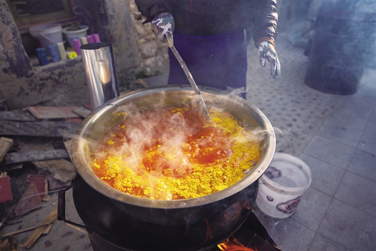 “玫紅色和黃色的都做完了吧?這個顏料水我倒了,開始準備制作青色。”一旁,61歲的央金將盆洗干凈,繼續煮水放入顏料。“‘羅薩梅朵’有青色、綠色、玫紅色、黃色四種顏色,其中青色耗時最長,不僅需要自己調制,而且最難上色。”央金說,“我們一般是早上7點開始上色,上完色都快下午4點了。”