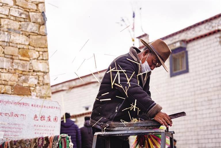 有人說,西藏的春天、夏天和秋天屬于格桑花,而冬天則屬于“羅薩梅朵”。對于桑木村的村民來說,“羅薩梅朵”不僅帶來收入,更是一種對傳統文化的堅守和熱愛。每年,村民們將一整間房的金黃麥穗和青稞穗備好,隨后拿出來一一上色。房內的麥穗越來越少,村民的腰包越來越鼓,大街小巷里越來越多的人手里拿著色彩繽紛的“羅薩梅朵”,臉上洋溢著幸福的笑容。