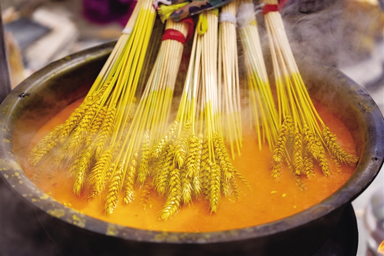 起灶、燒水……麥穗和青稞穗曬干后,就要開始上色。卓瑪次仁將顏料倒入開水中不斷攪拌,防止結塊。隨后,她將麥穗和青稞穗放入其中,反復浸泡、拿出,再浸泡、再拿出。幾遍之后,再將上好色的麥穗和青稞穗曬干、捆綁起來售賣。“顏料要反復調試,上色前先拿一根試色,確定成色完好后,再把一整束放進去反復煮。這個步驟看似簡單,但需要耐心和細心。”卓瑪次仁手中的麥穗從金黃慢慢變成玫紅色。