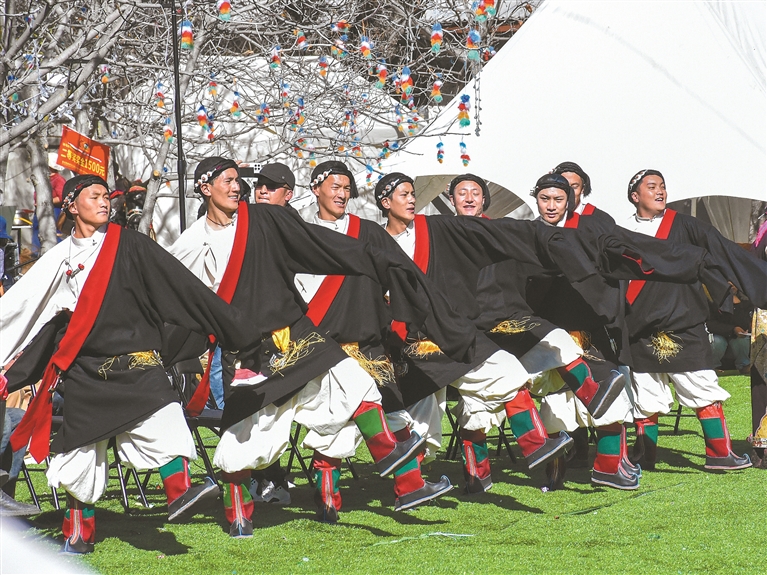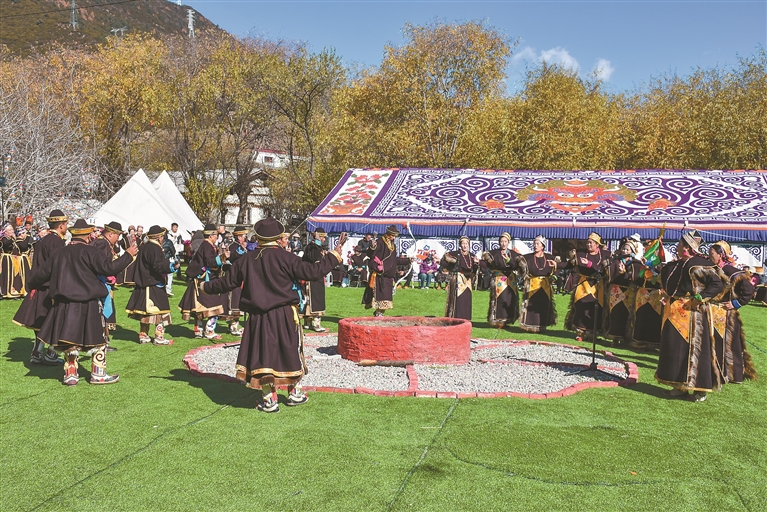 圖為林芝市布久鄉麥巴村群眾帶來的非遺舞蹈《工布切巴博》。