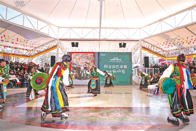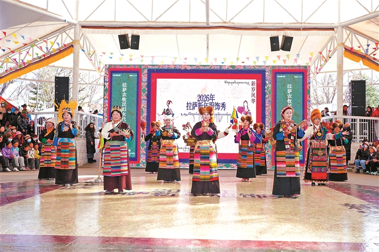 圖為2026拉薩新年服飾秀拉薩農牧民婦女代表“村T秀”宗角祿康公園活動現場。圖/記者 格桑倫珠