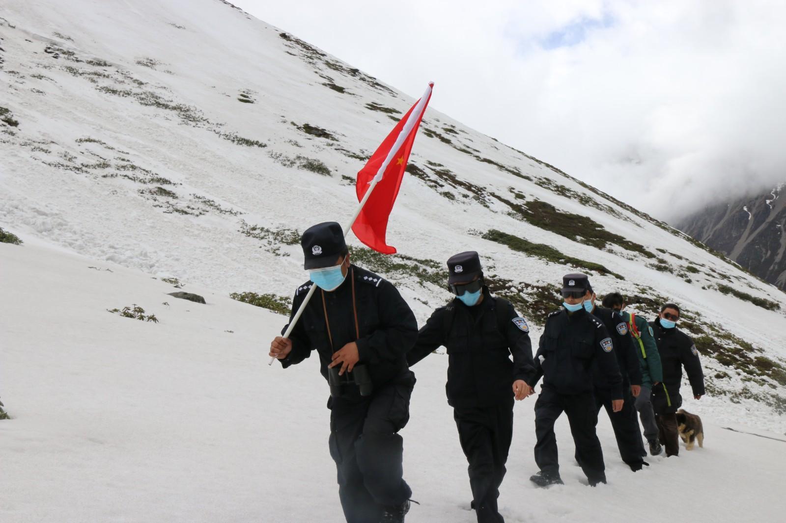 圖為山南普瑪江塘邊境派出所邊境一線崗布冰川巡邏踏查 。
