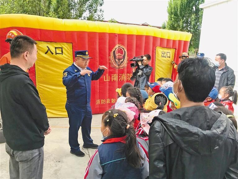 圖為消防員給小朋友普及消防安全知識。