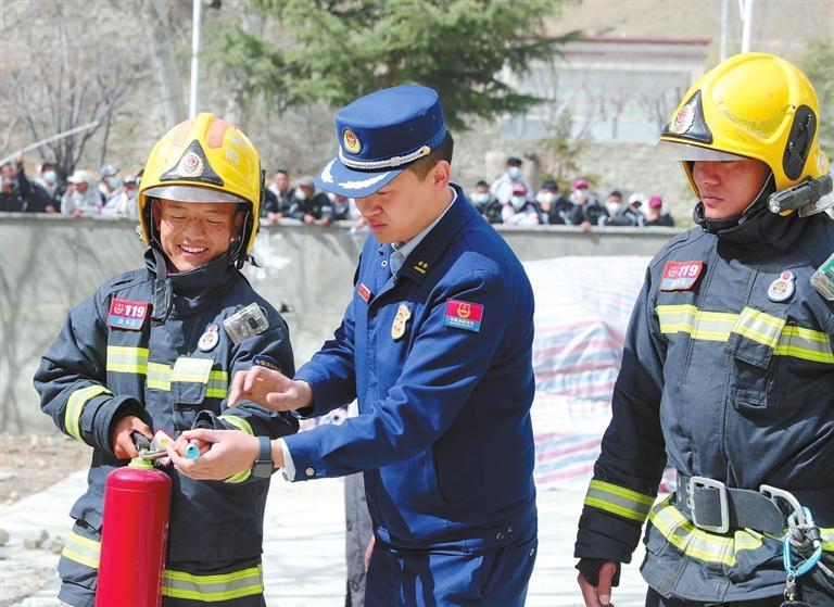 圖為山南市消防救援支隊消防員為山南市職業技術學校師生講解消防器材的使用。記者 洛桑 攝