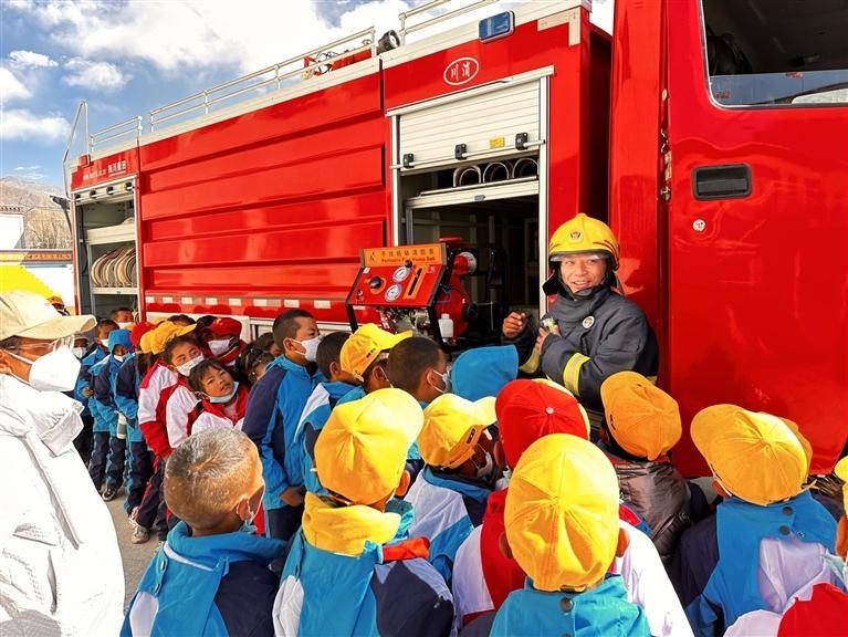 圖為日喀則市仁布縣消防中隊官兵向仁布縣切娃鄉中心小學學生普及消防安全知識。記者 丹增平措 攝