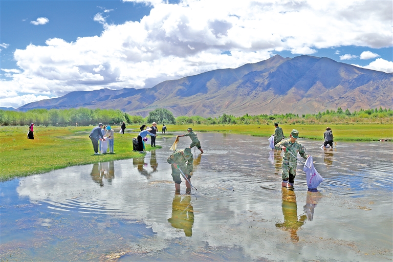 為充分尊重自然、順應自然、保護自然,提高廣大黨員骨干的綠色環(huán)保意識,6月30日,桑珠孜區(qū)人民武裝部聯(lián)合桑珠孜區(qū)退役軍人事務局,組織官兵與江當鄉(xiāng)、年木鄉(xiāng)退役軍人、民兵黨員在雅江中游河谷黑頸鶴保護區(qū)開展呵護綠水青山“七一”主題黨日活動。活動中,桑珠孜區(qū)人民武裝部組織黨員重溫入黨誓詞。隨后,30多名黨員開展了拉網(wǎng)式清理水域漂浮物和白色垃圾,給“高原精靈”營造一個美麗舒適的“家”。