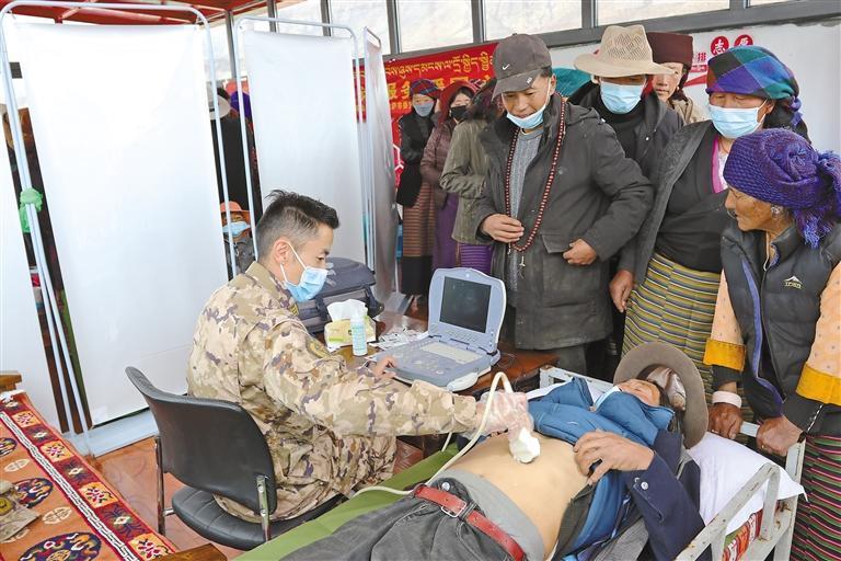 圖為醫(yī)務(wù)人員利用便攜式B超機(jī)為當(dāng)?shù)厝罕姍z查身體。記者 格桑倫珠 攝