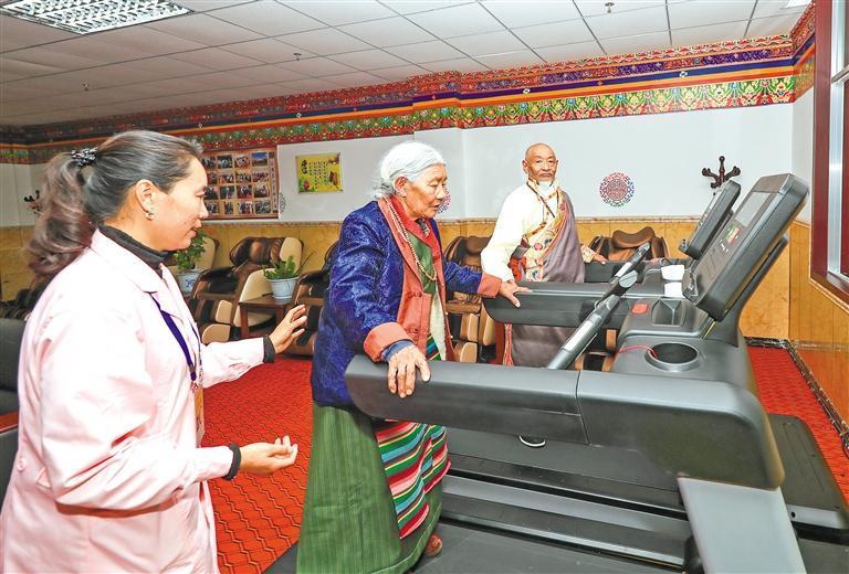 圖為在阿里地區(qū)噶爾縣老人集中供養(yǎng)中心,農(nóng)村特困老人在工作人員指導(dǎo)下進行運動。格桑吉美 攝