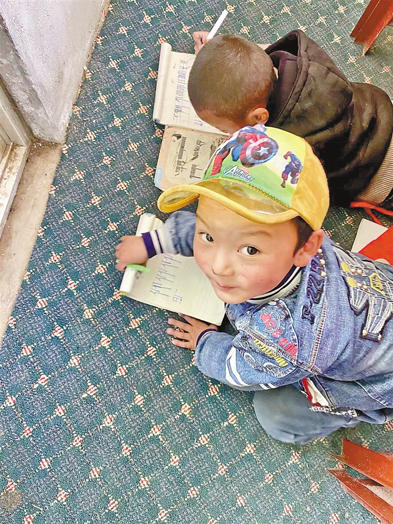 認真書寫藏文的孩子。