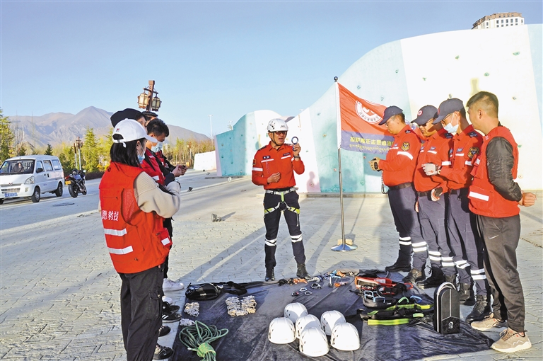 拉薩市青年志愿救援隊隊員開展日常應急培訓。