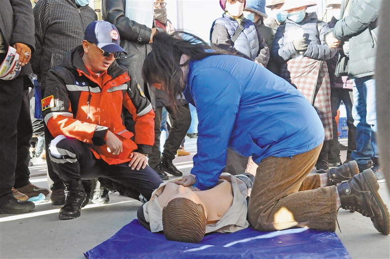 在國際志愿者日,拉薩市青年志愿救援隊隊員走進納如社區進行現場急救演練。
