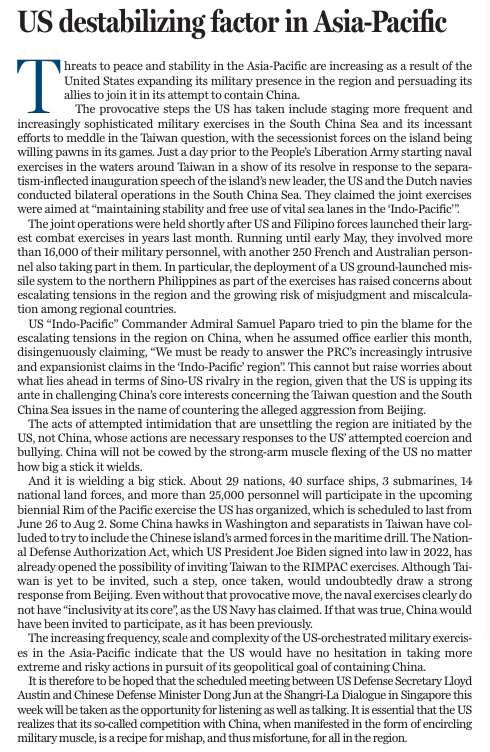 本文譯自《中國日?qǐng)?bào)》5月28日社論
