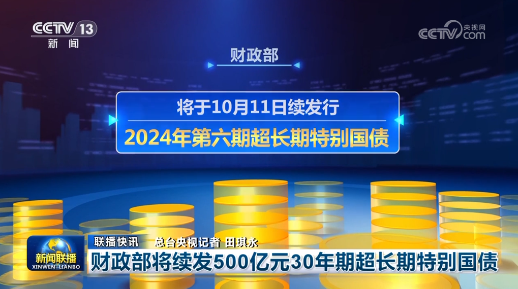 財政部將于10月11日續發行2024年第六期超長期特別國債。本次續發行國債為30年期固定利率附息債,發行總額500億元。截至目前,財政部今年已發行7520億元超長期特別國債,支持國家重大戰略實施和重點領域安全能力建設,支持大規模設備更新和消費品以舊換新。