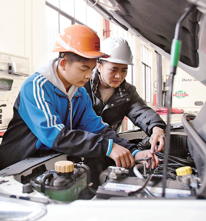 湖南省永州市江永縣職業中專學校的老師在指導學生進行汽修實踐操作。田如瑞攝/光明圖片