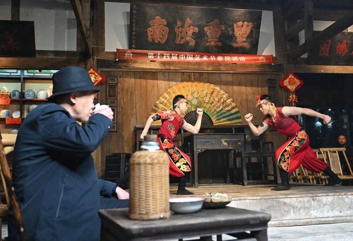 2025年10月25日,茶客在成都金琴老茶館一邊喝茶一邊觀看沈陽雜技演藝集團雜技演員表演的雜技節目《男子對手》,這是第十四屆中國藝術節惠民活動之一。新華社記者 劉坤 攝