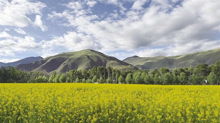 從拉薩出發,沿著國道109線一路向西,驅車一小時即可到達堆龍德慶區境內。這里有上千畝的油菜花開得正艷,金黃一片,與綠色的青稞田地、村莊溪流構成一幅絕美畫卷。