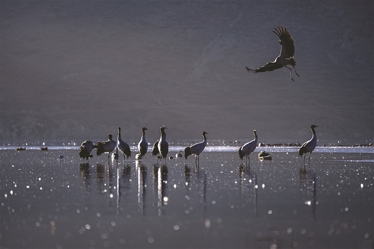 來到卡孜水庫,只見水面上薄霧未散,黑頸鶴的鳴叫聲劃破靜謐,那聲音清亮卻不刺耳,像帶著高原特有的通透感,時(shí)而短促清脆伴著水波蕩漾的輕響,似乎在訴說著高原的故事。循聲望去,幾只黑頸鶴正在湖面上悠然佇立,修長的脖頸微微彎曲,倒映在平靜的水面上,宛如水墨畫卷中的靈動(dòng)筆觸;忽然間,幾只黑頸鶴率先舒展雙翼,寬大的翅膀劃破晨霧,腳掌蹬離水面時(shí)濺起細(xì)碎的水花,身姿矯健地朝著高空飛去,其余黑頸鶴也相繼展翅,追隨同伴的身影扶搖而上,朝著村落方向飛去。當(dāng)它們從錯(cuò)落有致的村民住房上空掠過時(shí),晨光恰好穿透薄霧,灑在灰褐色的羽翼上,下方屋頂升起裊裊炊煙,動(dòng)靜之間,勾勒出一幅人與自然和諧共生的鮮活圖景。
