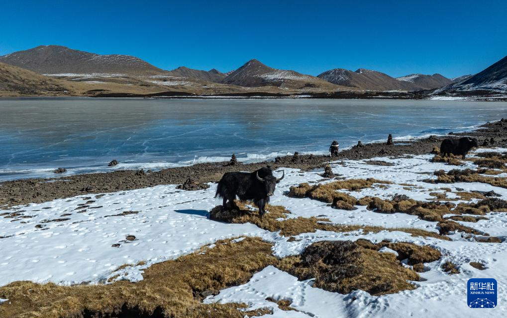 12月13日,牦牛駐足在思金拉錯湖岸(無人機照片)。新華社記者 丁增尼達 攝
