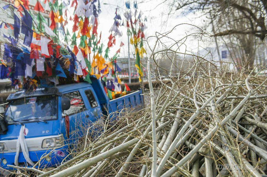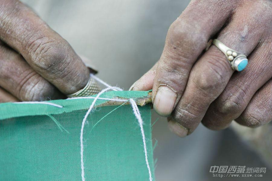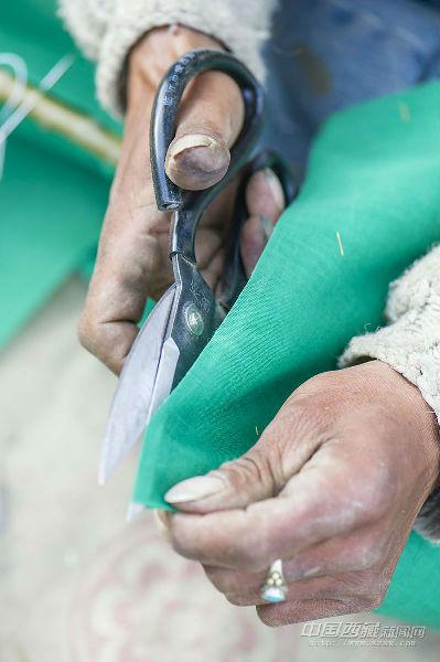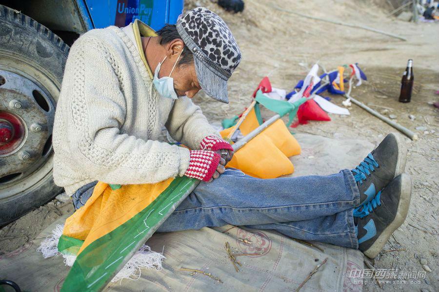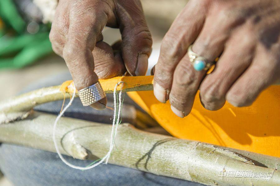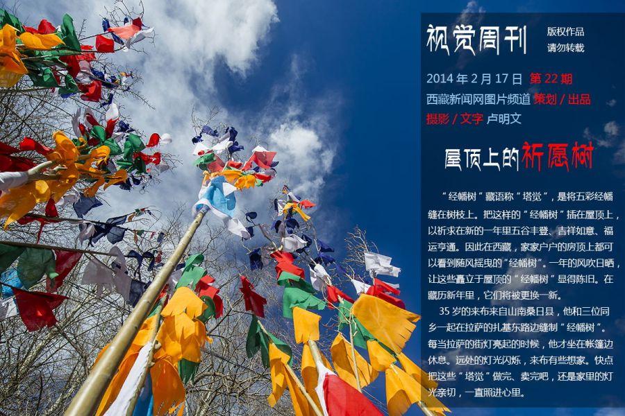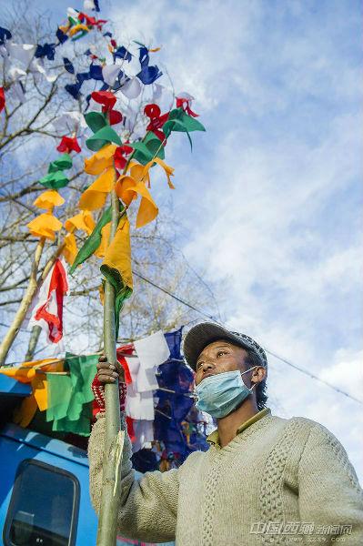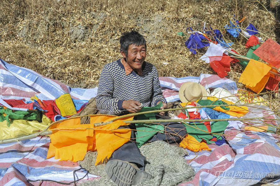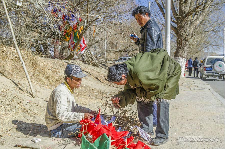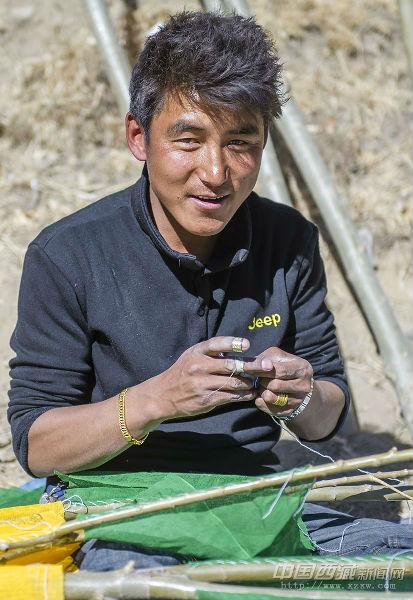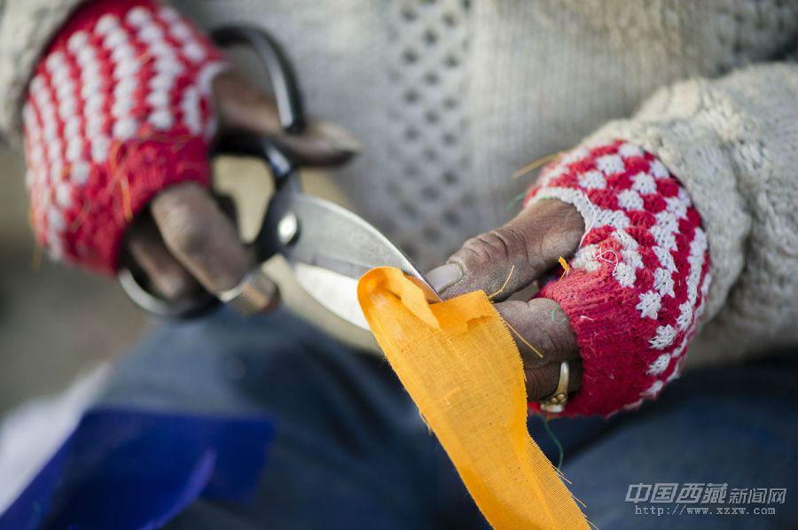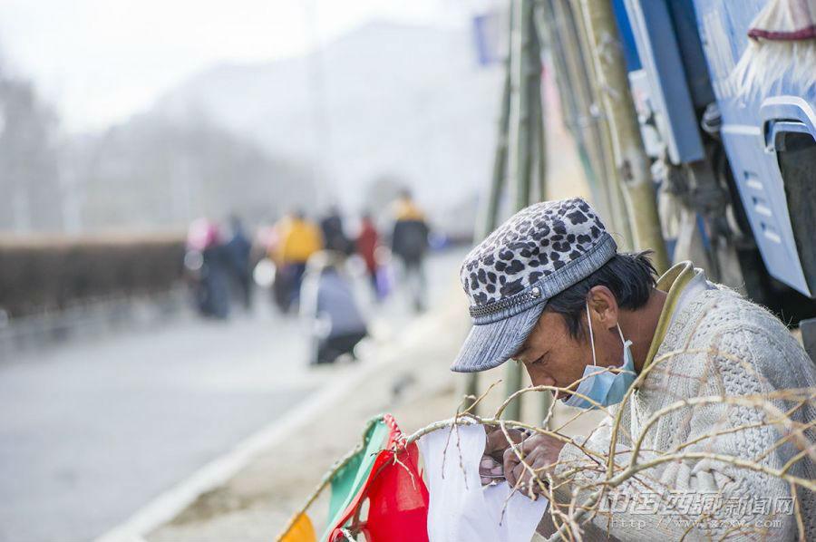 “經幡樹”藏語稱“塔覺”,是將五彩經幡縫在樹枝上。把這樣的“經幡樹”插在屋頂上,以祈求在新的一年里五谷豐登、吉祥如意、福運亨通。因此在西藏,家家戶戶的房頂上都可以看到隨風搖曳的“經幡樹”。 經幡樹上顏色的先后順序是有講究的,從上至下依次為藍、白、紅、綠、黃五種顏色。這樣的順序不能隨意調換,因為各種顏色的經幡有著天地自然的象征,分別代表了藍天、白云、火焰、綠水和黃土,是人們將美好愿望寄托于自然的一種表現。 一年的風吹日曬,讓這些矗立于屋頂的“經幡樹”顯得陳舊。在藏歷新年里,它們將被更換一新。經幡樹換新的日子是不能隨意選擇的,一般選在藏歷新年初一過后某一個良辰吉日。這一天,全院的人都穿上節日盛裝,帶上節日食品和供品,聚集在屋頂上,舉行隆重而歡樂的“托桑”(祈福)儀式,并為自家的房頂更換五彩經幡。之后所有人一起在屋頂聚餐,互祝吉祥。 35歲的來布來自山南桑日縣,他和三位同鄉一起在拉薩的扎基東路邊縫制“經幡樹”。每當拉薩的街燈亮起的時候,他才坐在帳篷邊休息。遠處的燈光閃爍,來布有些想家。快點把這些“塔覺”做完、賣完吧,還是家里的燈光親切,一直照進心里。圖文/盧明文