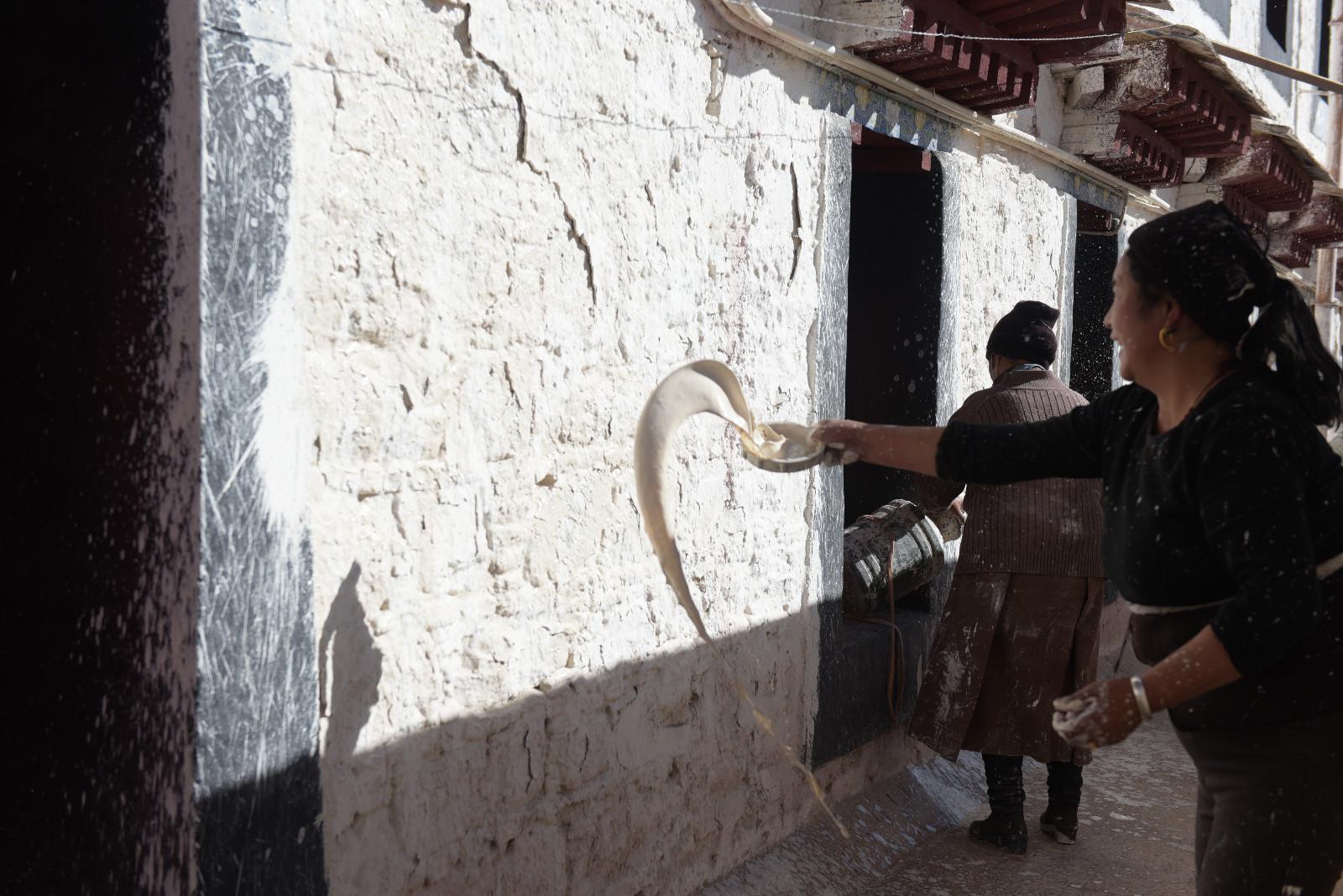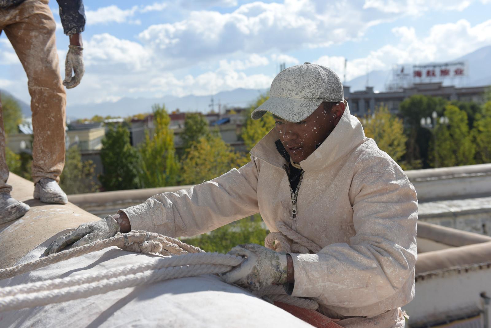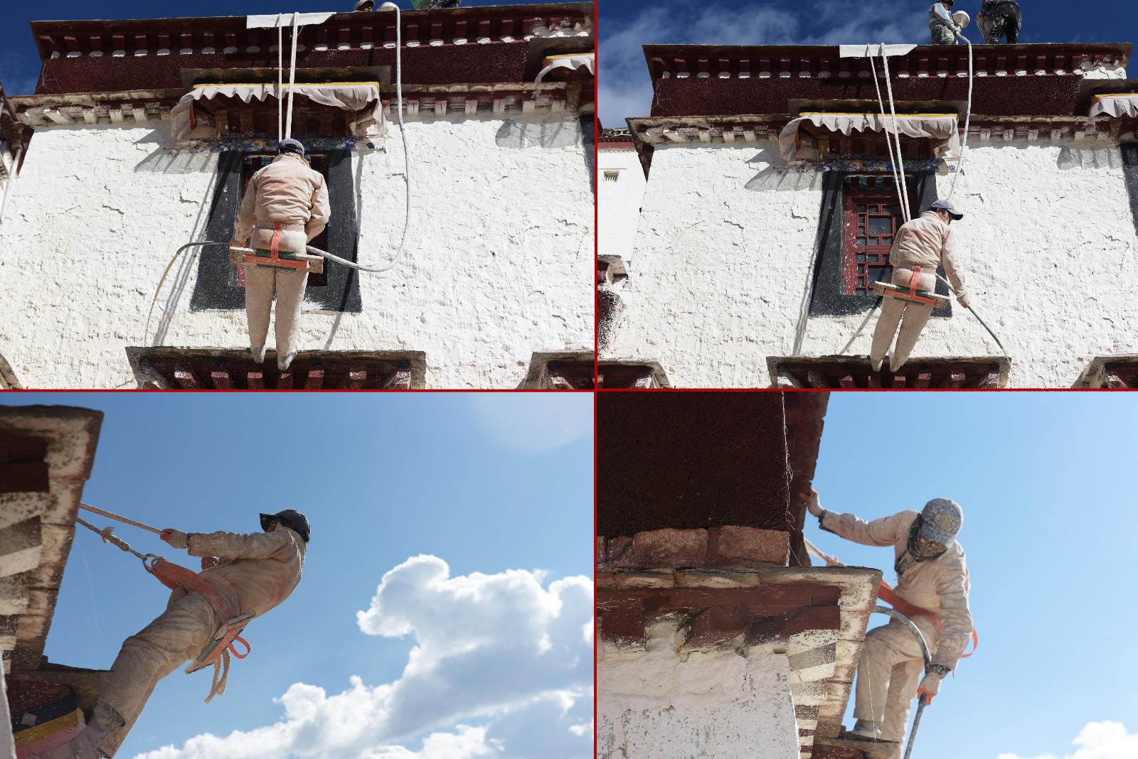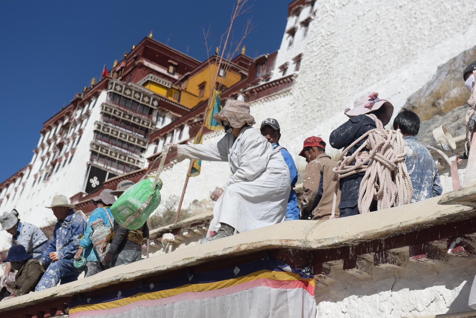 每年藏歷9月22日是西藏的降神節,傳說在這一天之前刷的最干凈的房間,在這一天會有神仙降臨居住。每年布達拉宮都會首先開始粉刷宮殿,以嶄新的面貌迎接降神節的到來。每年的粉刷其主要目的是為了保護建筑本身。雨季過后,經過雨水沖刷的布宮墻體土質疏松,木質材料容易蛀蟲、腐爛,所以與其他建筑不同,粉刷布宮的涂料中要添加牛奶、白糖、藏紅花等。