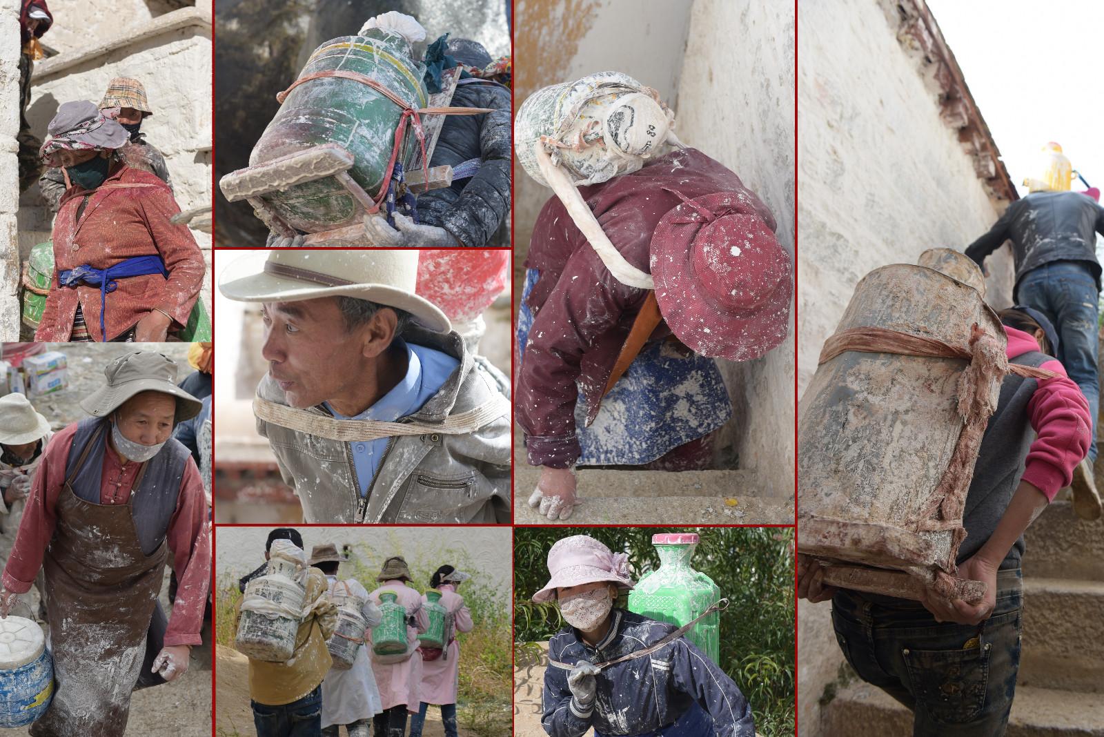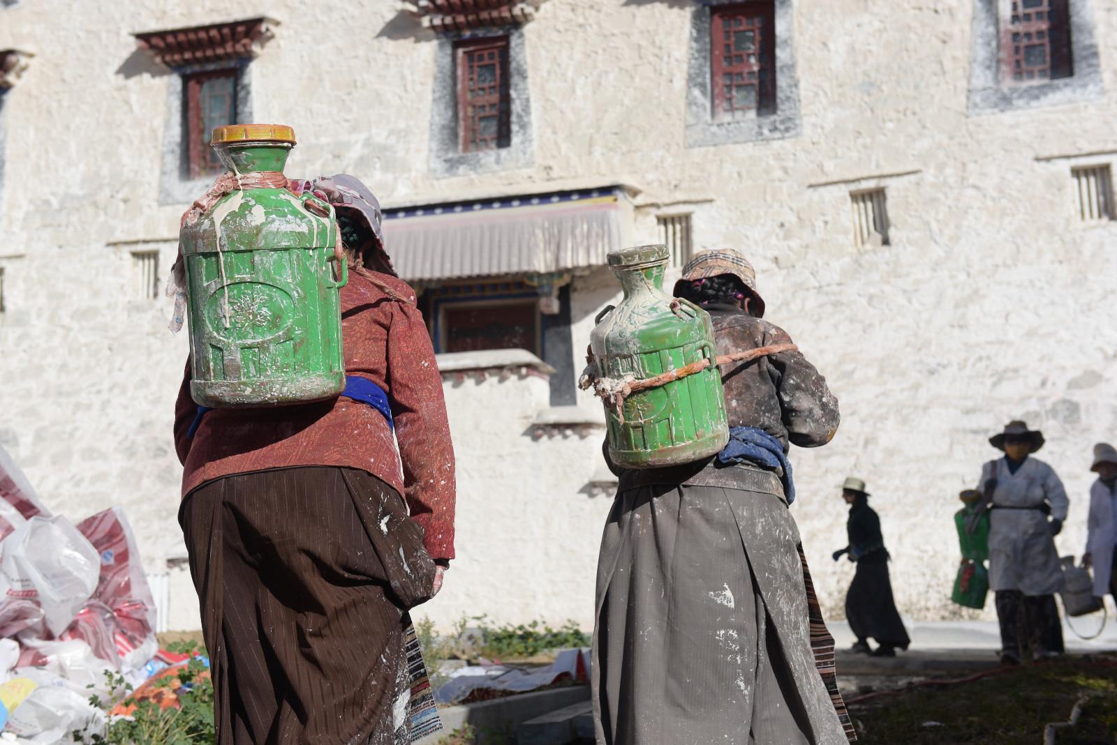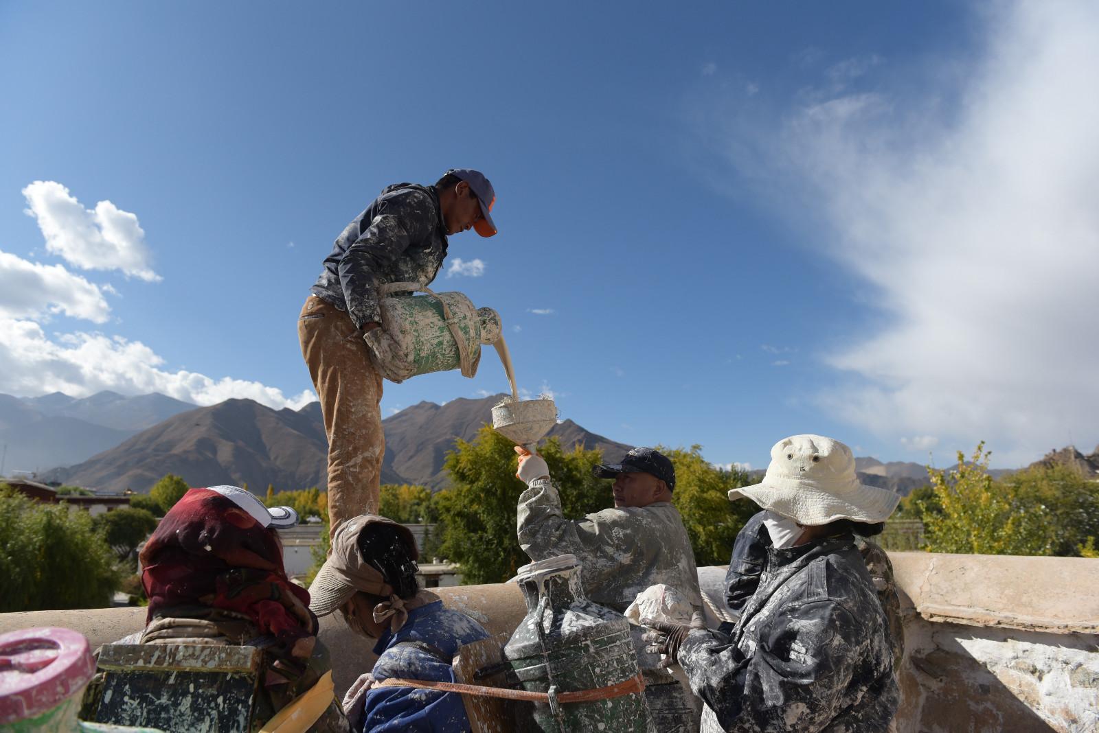 每年藏歷9月22日是西藏的降神節,傳說在這一天之前刷的最干凈的房間,在這一天會有神仙降臨居住。每年布達拉宮都會首先開始粉刷宮殿,以嶄新的面貌迎接降神節的到來。每年的粉刷其主要目的是為了保護建筑本身。雨季過后,經過雨水沖刷的布宮墻體土質疏松,木質材料容易蛀蟲、腐爛,所以與其他建筑不同,粉刷布宮的涂料中要添加牛奶、白糖、藏紅花等。