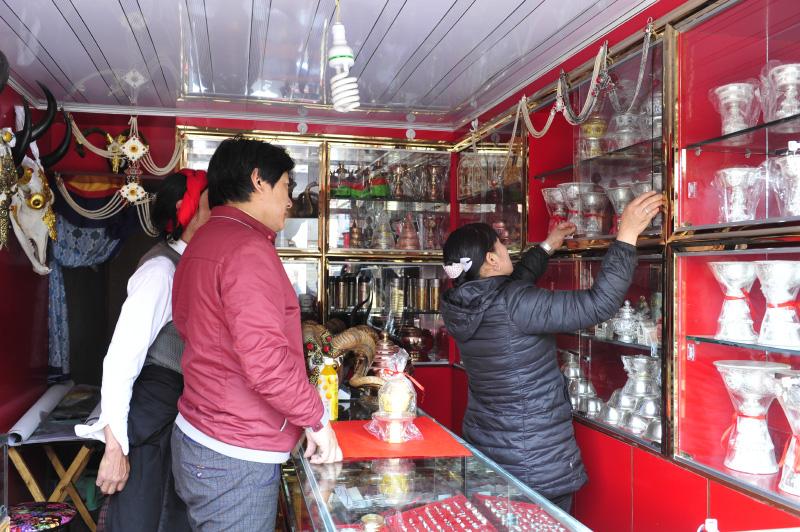 來自云南大理鶴慶縣河頭村的高建文在拉薩已經打拼了21年,在他從業的這些年中,他做過各種金銀銅器,也了解加工技藝。不過,他最拿手的還是制作藏刀。高建文做的藏刀因為用料實在,做工精巧,價格便宜,得到不少藏族同胞的認可。