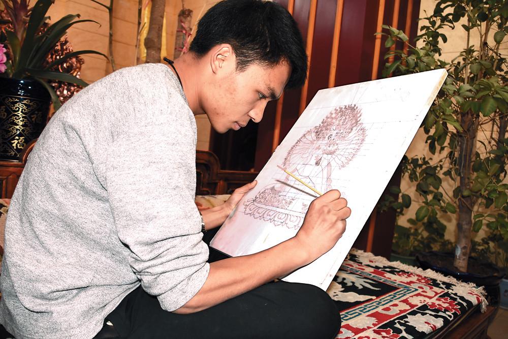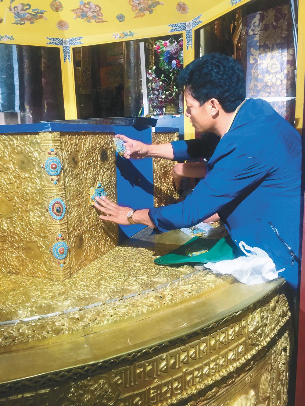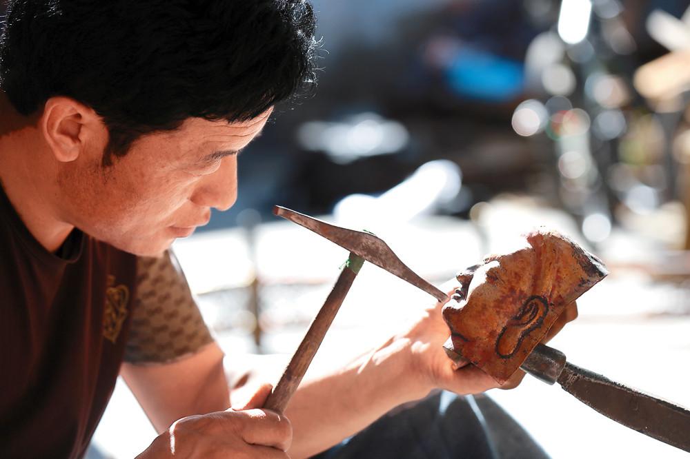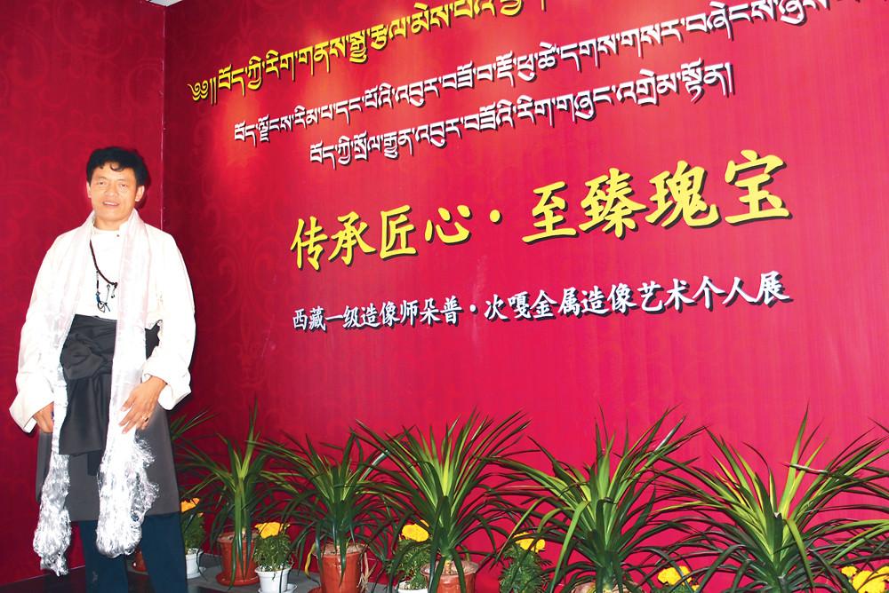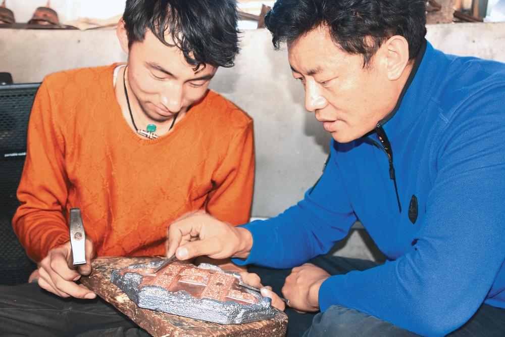 在朵普·次嘎家的藏式茶幾上,一束金屬鍛鑄造的花與尋常人家的裝飾與眾不同。三朵銅花插在一個銅制的花瓶里,一顆花骨朵,含苞待放微微低頭;一朵漸次開放,以婀娜的姿態向上舒展;一朵層層綻放,絲絲花蕊栩栩如生。一圈銀質的花紋繞在瓶頸處,一對遨游的龍和一對嬉戲的鹿雕刻在瓶身,無論是大處還是細節都能看出鍛鑄造者成熟的技藝和對藝術之美的極致追求。