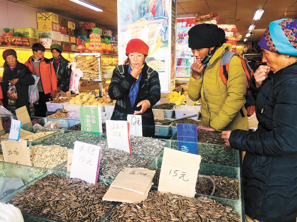 今年的藏歷土狗新年和農歷春節恰巧在同一天,因此拉薩的年味似乎更濃——大街小巷中人頭攢動、熙熙攘攘,挑著各色年貨游走叫賣的商販穿梭其間,好不熱鬧。(格桑倫珠 劉楓 次珍 楊子彥 實習生 斯曲 攝)