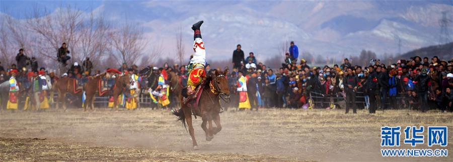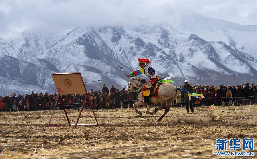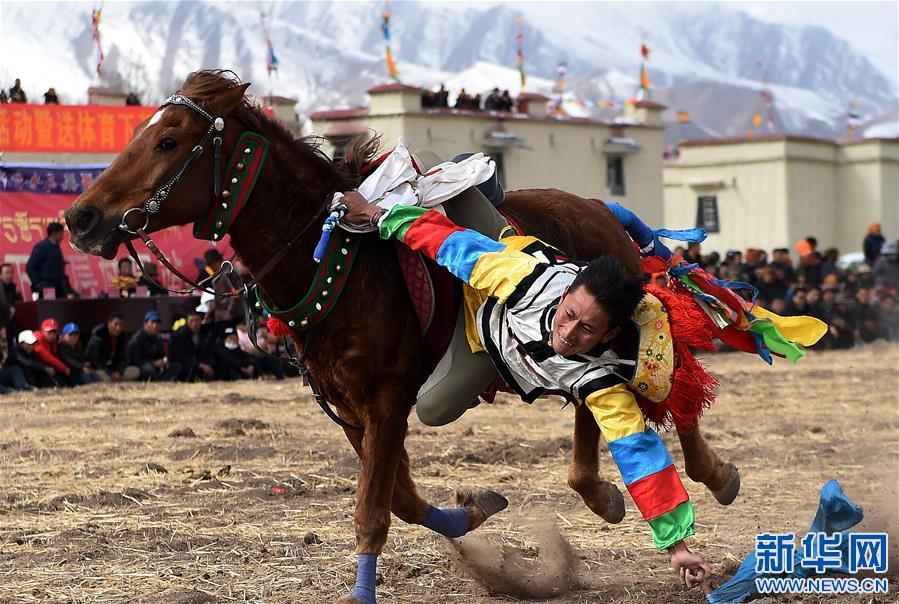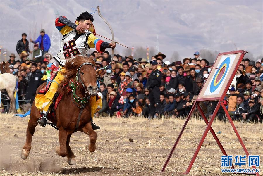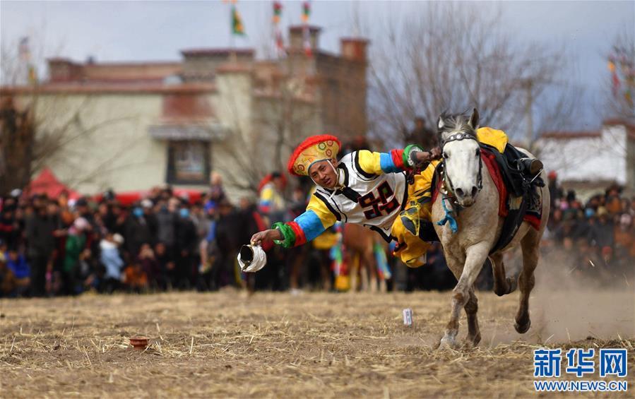 2月25日,在西藏自治區(qū)拉薩市林周縣甘旦曲果鎮(zhèn)江角村的一塊農(nóng)閑田地上,西藏民族傳統(tǒng)馬術(shù)隊的隊員們?yōu)猷l(xiāng)親們送上了精彩的馬術(shù)表演?!榜R上射箭”、“馬上拾哈達”、“疊羅漢”等12個大項、28個小項的精彩表演節(jié)目,讓觀眾在藏歷新年期間享受了一場視覺盛宴。