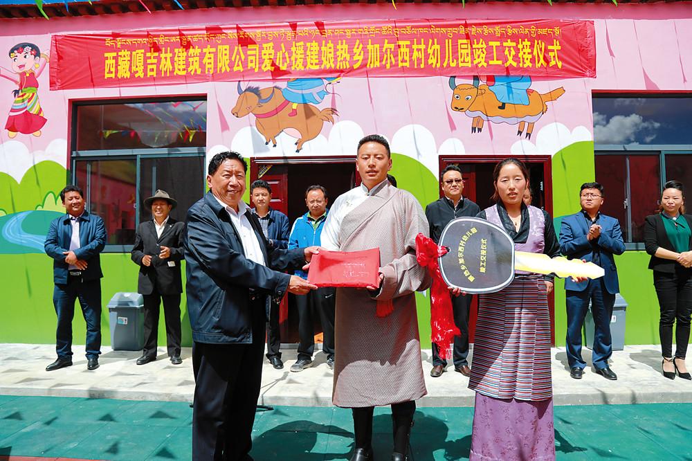 日前,西藏嘎吉林建筑有限公司援建娘熱鄉加爾西村幼兒園項目竣工,嘎吉林建筑有限公司向加爾西村委會移交幼兒園鑰匙,并贈送5萬元幼兒伙食補貼。