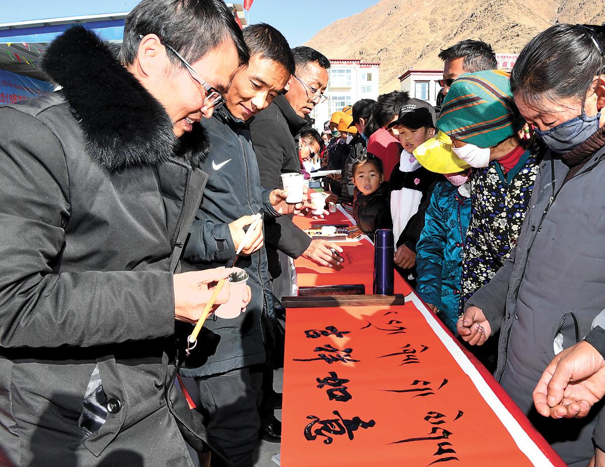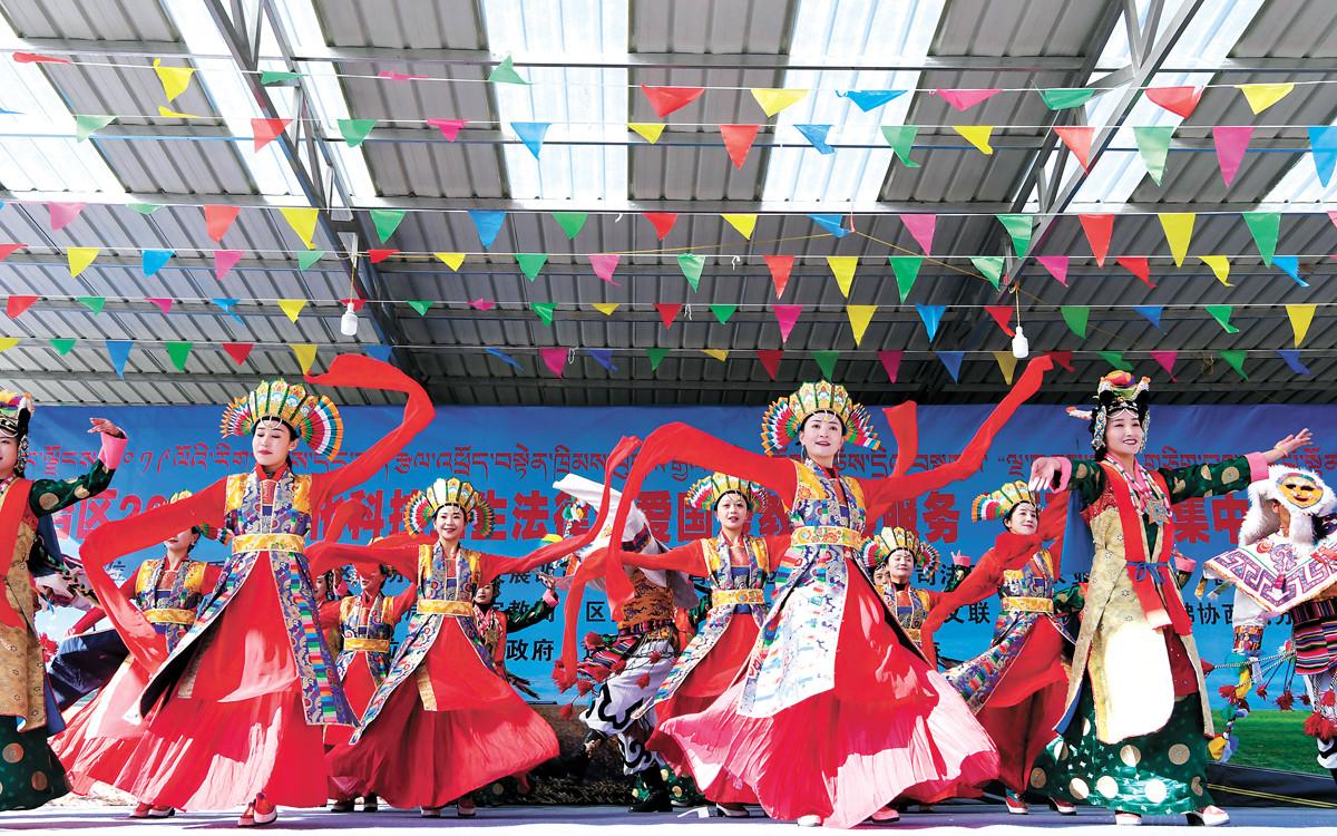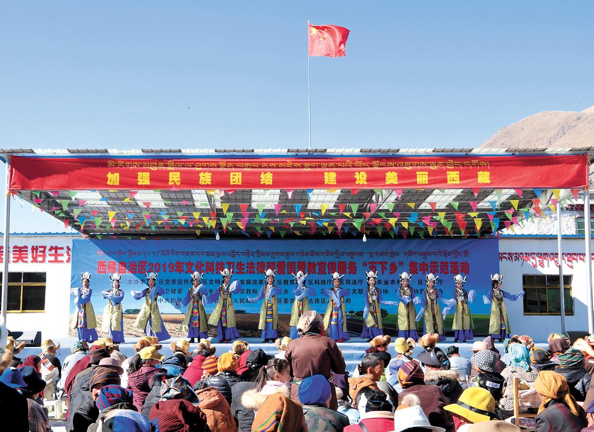 1月17日上午,來自自治區(qū)藏戲團、歌舞團、話劇團、藏劇團的文藝工作者也為現(xiàn)場一千多名群眾帶來了一場精彩的文藝演出。此次活動標志著自治區(qū)2019年“五下鄉(xiāng)”活動的全面啟動。(記者 洛桑 攝)