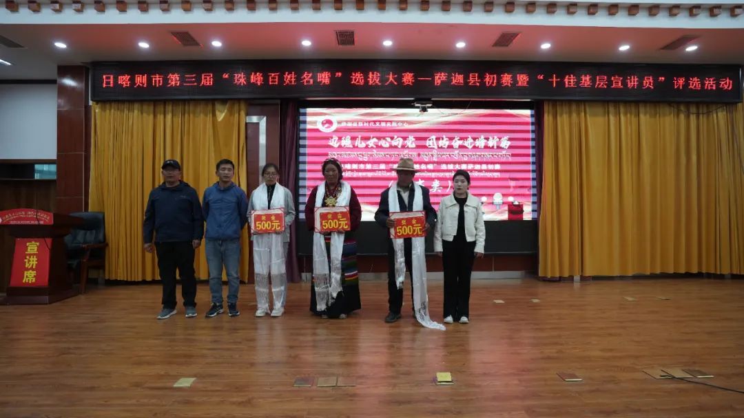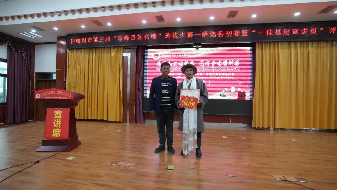 比賽最后,開展了縣級“十佳基層宣講員”評選活動,在“珠峰百姓名嘴”選拔賽中榮獲政策類、故事類前五名的選手被推選為薩迦縣2024年度“十佳基層宣講員”,并頒發(fā)榮譽(yù)證書和禮品。