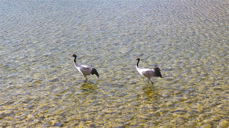 記者觀察到,黑頸鶴在龍雪河谷旁時而低頭覓食,時而閑庭信步,時而揮翅舒展,它們的身影與遠處成群結隊的牛馬、皚皚雪山以及清澈的湖水互交互織,構成了一幅人與自然和諧共生的美好畫卷。