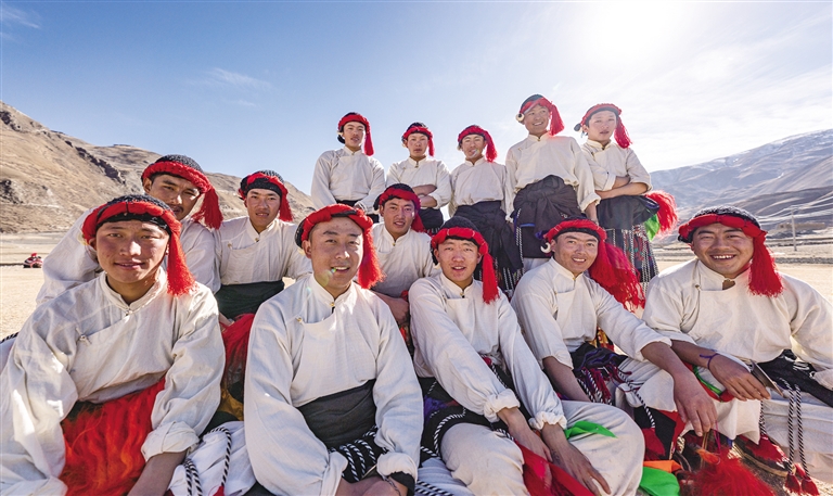 西藏昌都市丁青縣尺犢鎮烏巴村文藝演出隊部分成員合影留念(1月5日攝)。