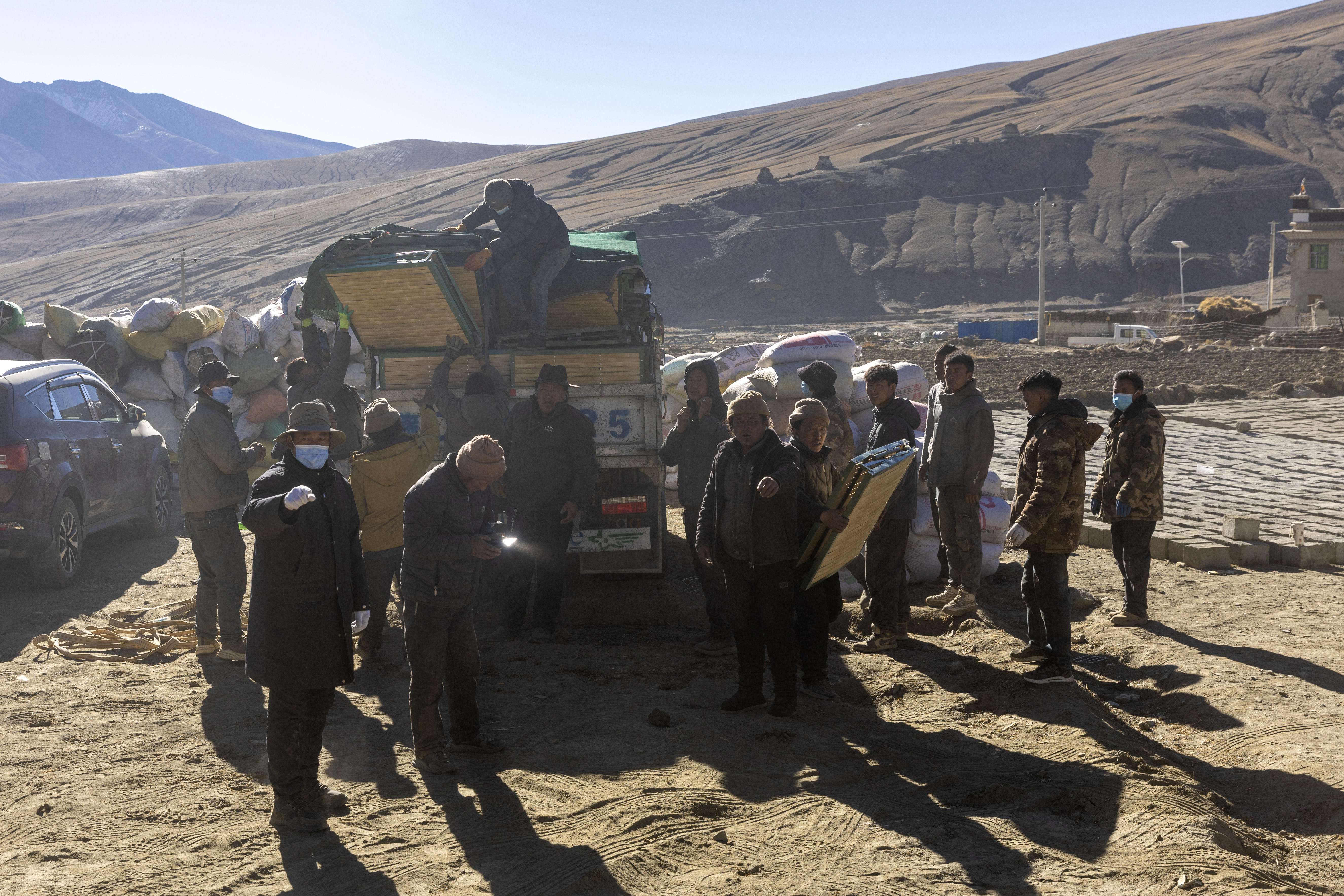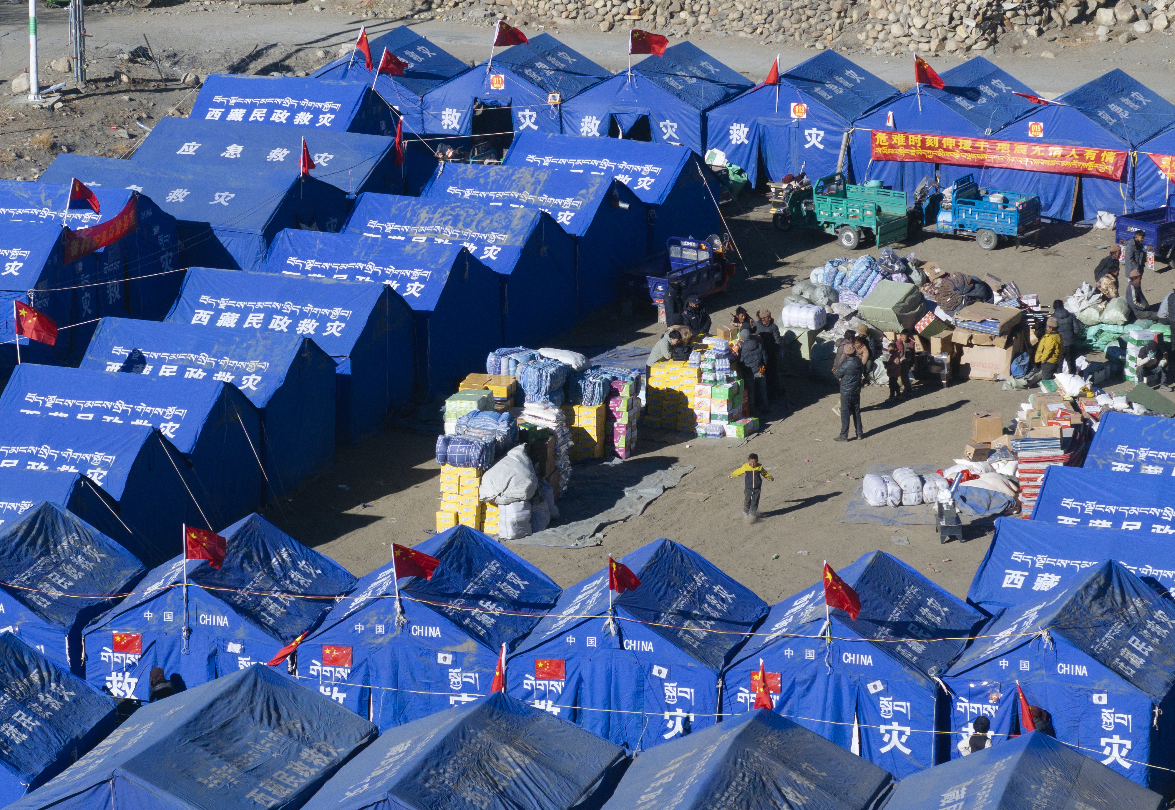 1月11日,在受西藏定日6.8級地震影響的薩迦縣麻布加鄉普村,水、電、燃料、食物等物資已運抵受災群眾安置點,政府安排的活動板房也在當日下午開始建設。