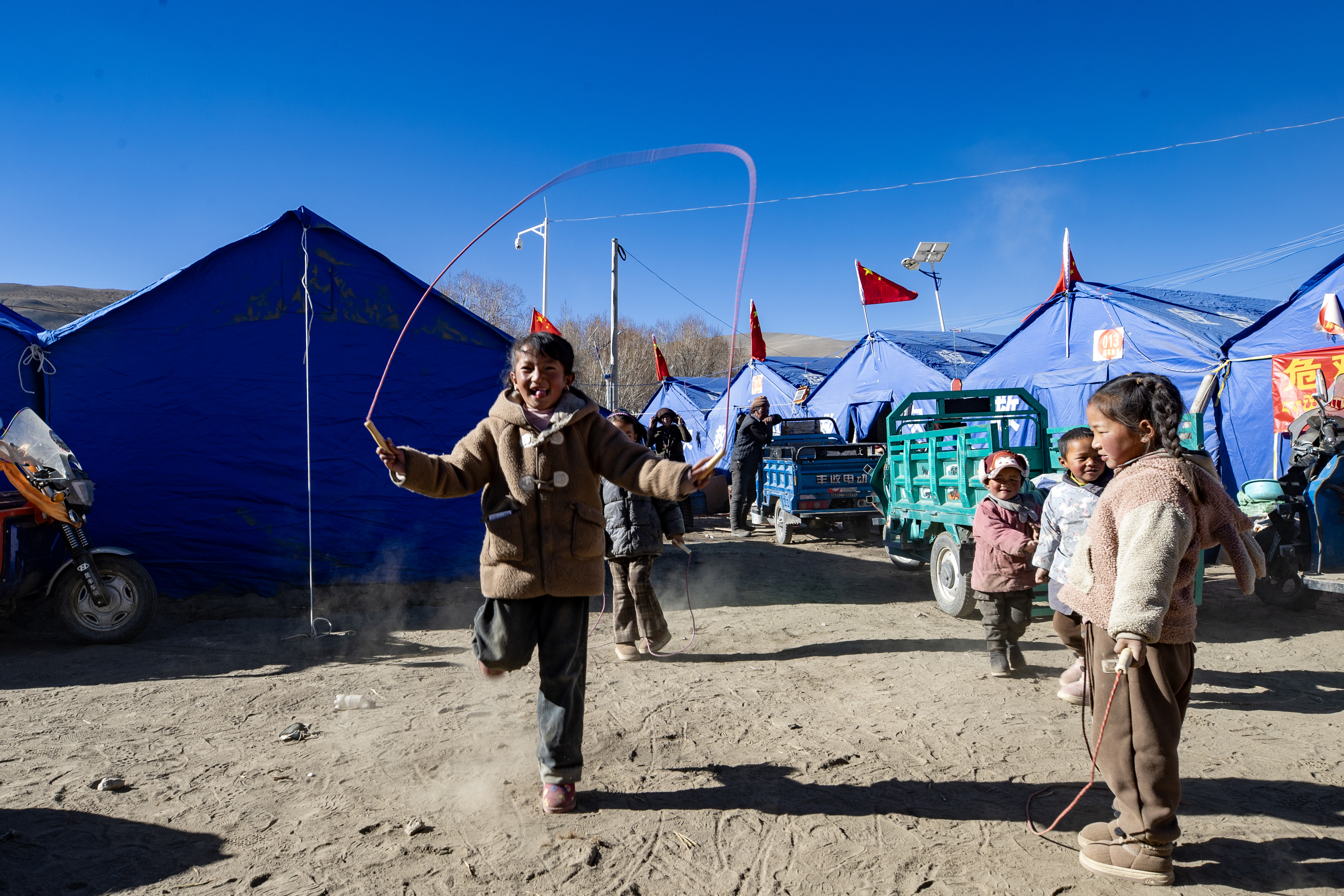 1月11日,小朋友在普村安置點跳繩。新華社記者 姜帆 攝