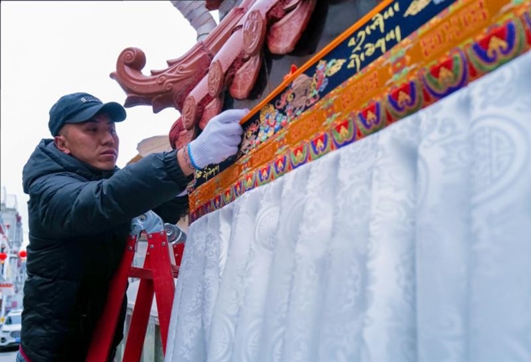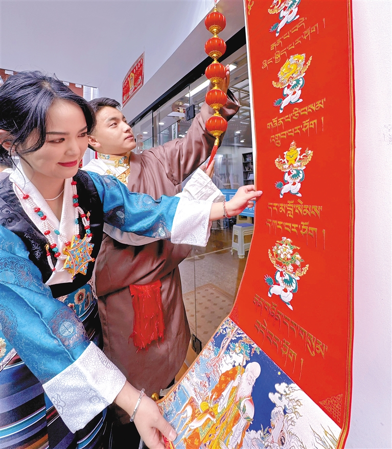 圖為拉薩市城關區夏薩蘇社區群眾在貼藏式春聯。本網記者 洛桑 攝