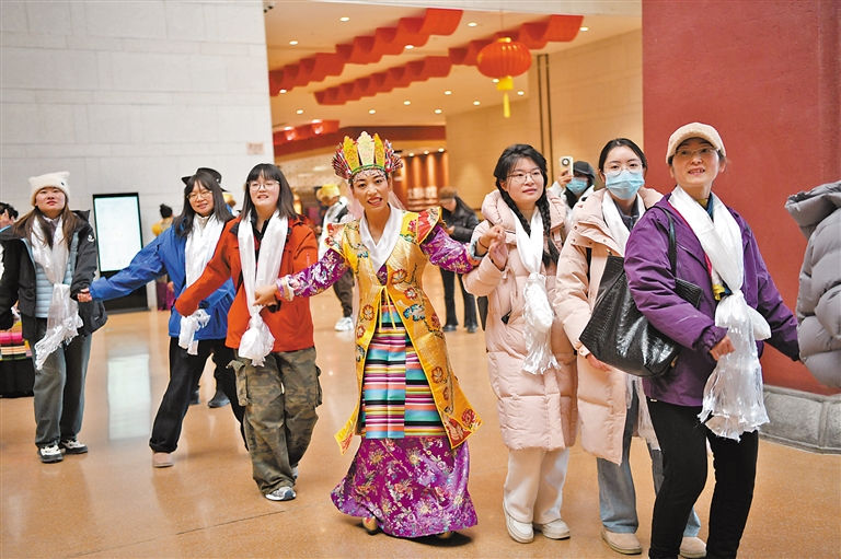 圖為藏歷新年期間,西藏博物館舉行“傳承·共慶”藏歷新年年俗活動。游客在活動中與當地群眾一起跳鍋莊。 本網記者 王敏 攝